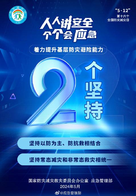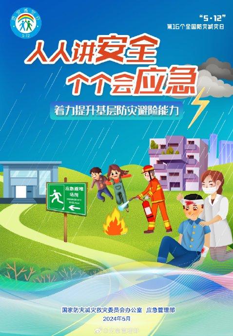 今年5月12日是第16个全国防灾减灾日,主题是“人人讲安全、个个会应急——着力提升基层防灾避险能力”。5月11日至17日为防灾减灾宣传周。全国防灾减灾救灾委员会办公室、应急管理部发布官方主题宣传海报。