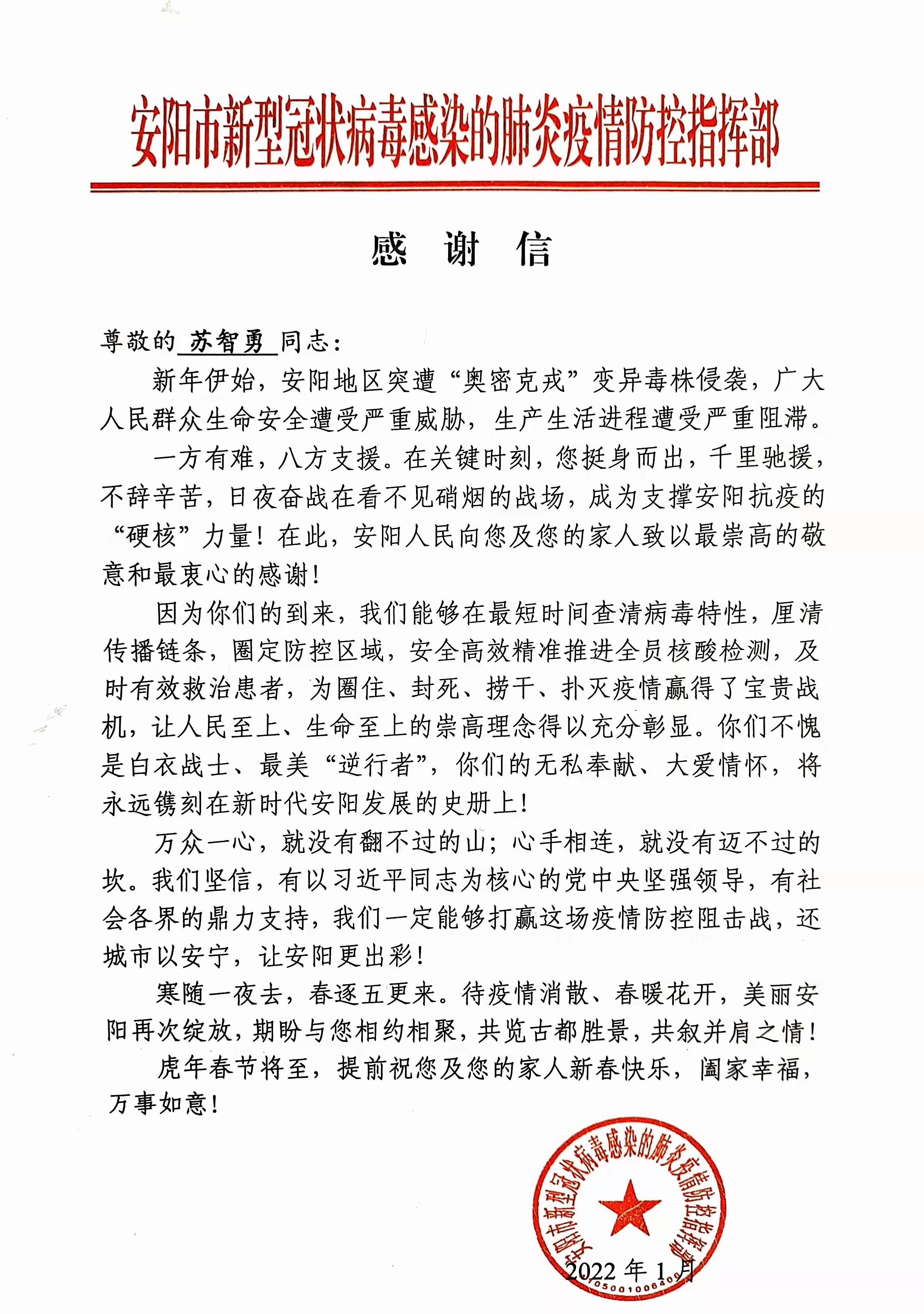 我院援豫核酸检测医务人员收到各方感谢信