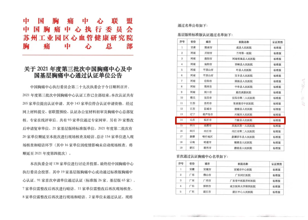 喜讯!兰陵县人民医院胸痛中心顺利通过国家胸痛中心(标准版)认证